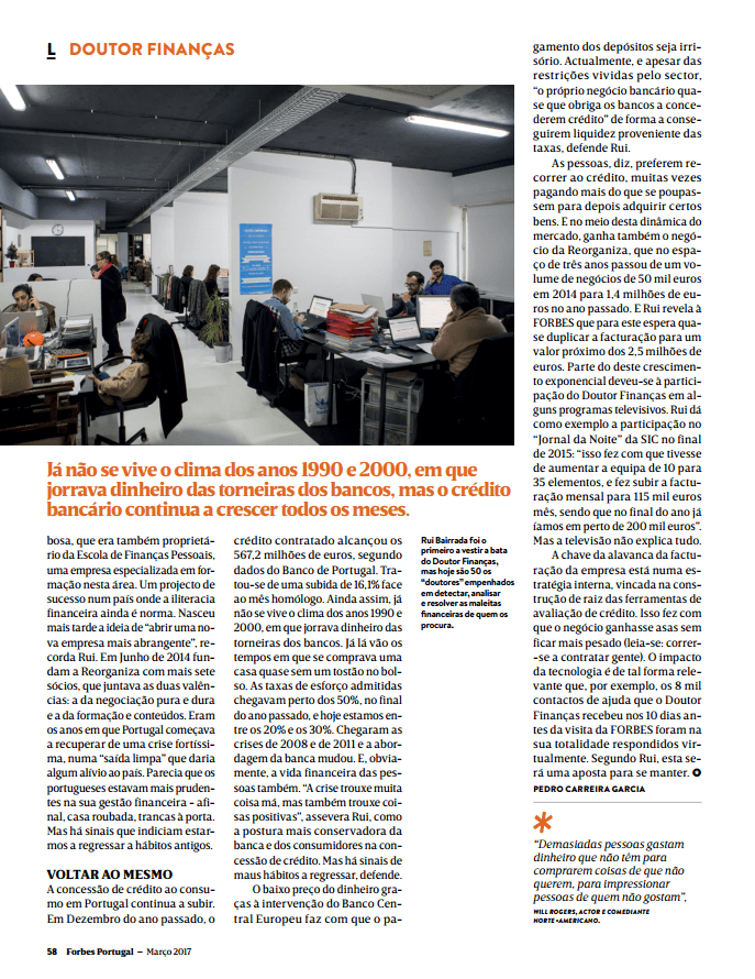 Na edição deste mês da revista Forbes, o Doutor Finanças aborda as três maiores dores da carteira dos portugueses e as respetivas curas. Veja se partilha as mesmas dores e como pô-las em prática. O artigo é da revista Forbes e pode lê-lo na íntegra nas imagens mais abaixo.