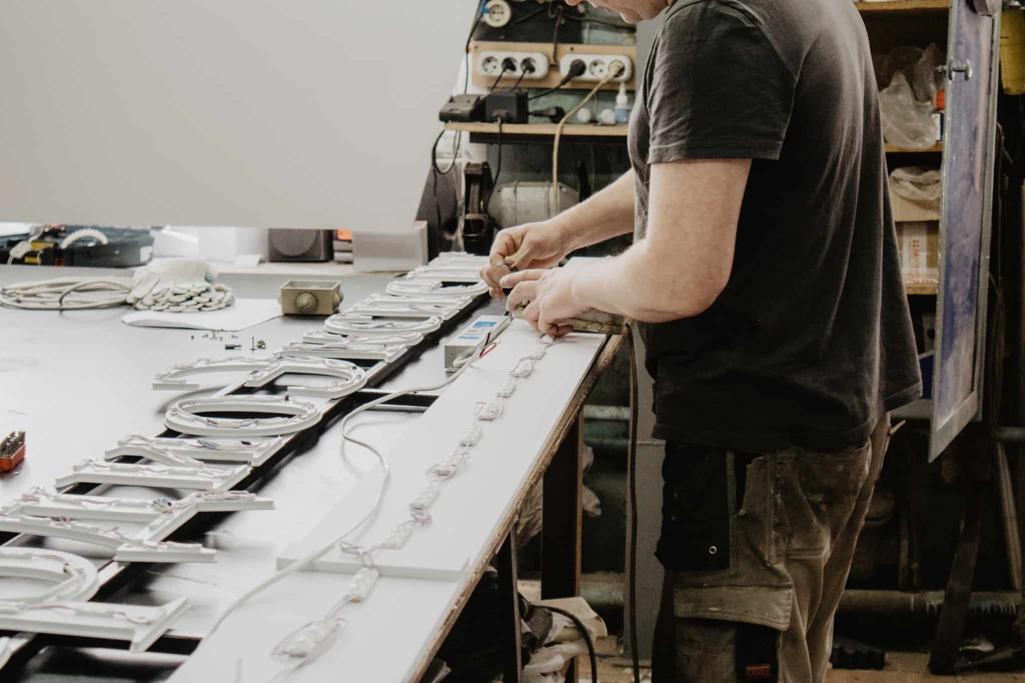 Mão de homem segura um pequeno saco de serapilheira com um cifrão inscrito. Em frente estão vários conjuntos de pequenos bonecos, numa alusão aos trabalhadores