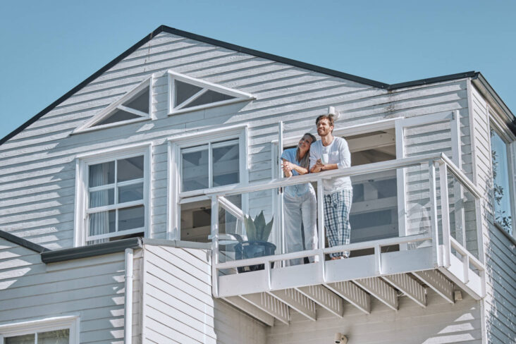 Duas pessoas sentadas numa mesa, uma com uma casa numa mão e outra com uma chave a ilustrar o processo para comprar um imóvel
