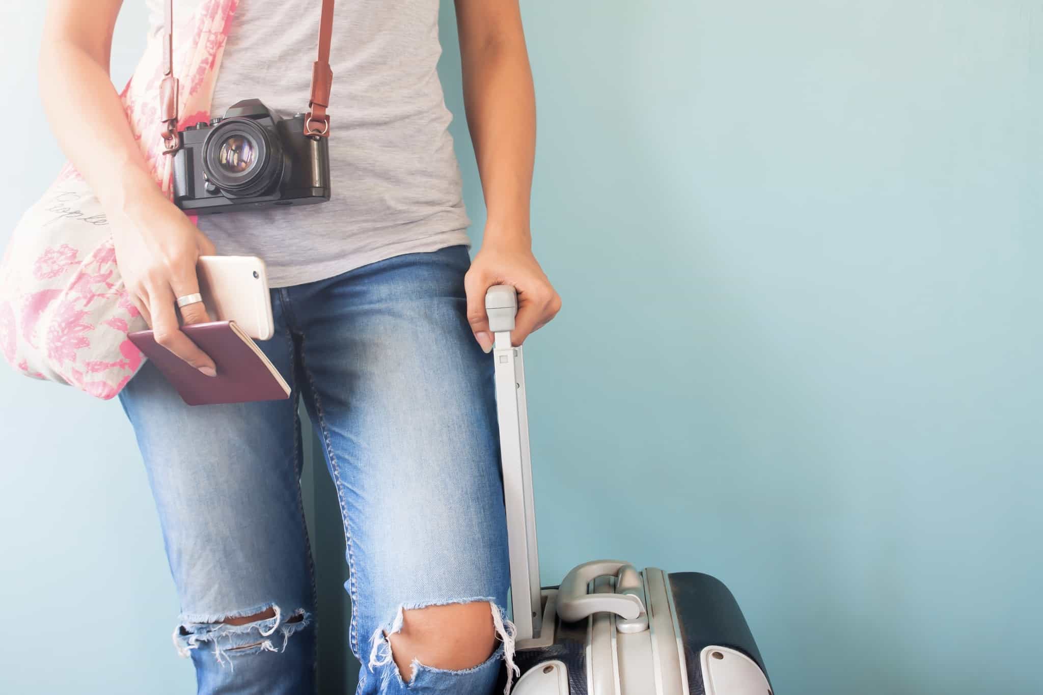 Mulher no meio da natureza a tirar fotos durante as suas férias após optar por um turismo sustentável