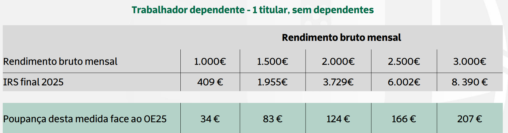 O Governo já avançou com algumas simulações, que apontam para que um trabalhador solteiro, sem dependentes, tenha uma poupança entre os 34 euros e os 207 euros. Isto considerando rendimentos entre os 1.000 e os 3.000 euros (que se enquadram nos escalões abrangidos pela redução dos IRS). O mesmo é dizer que o impacto mensal pode variar entre 2 e 15 euros.