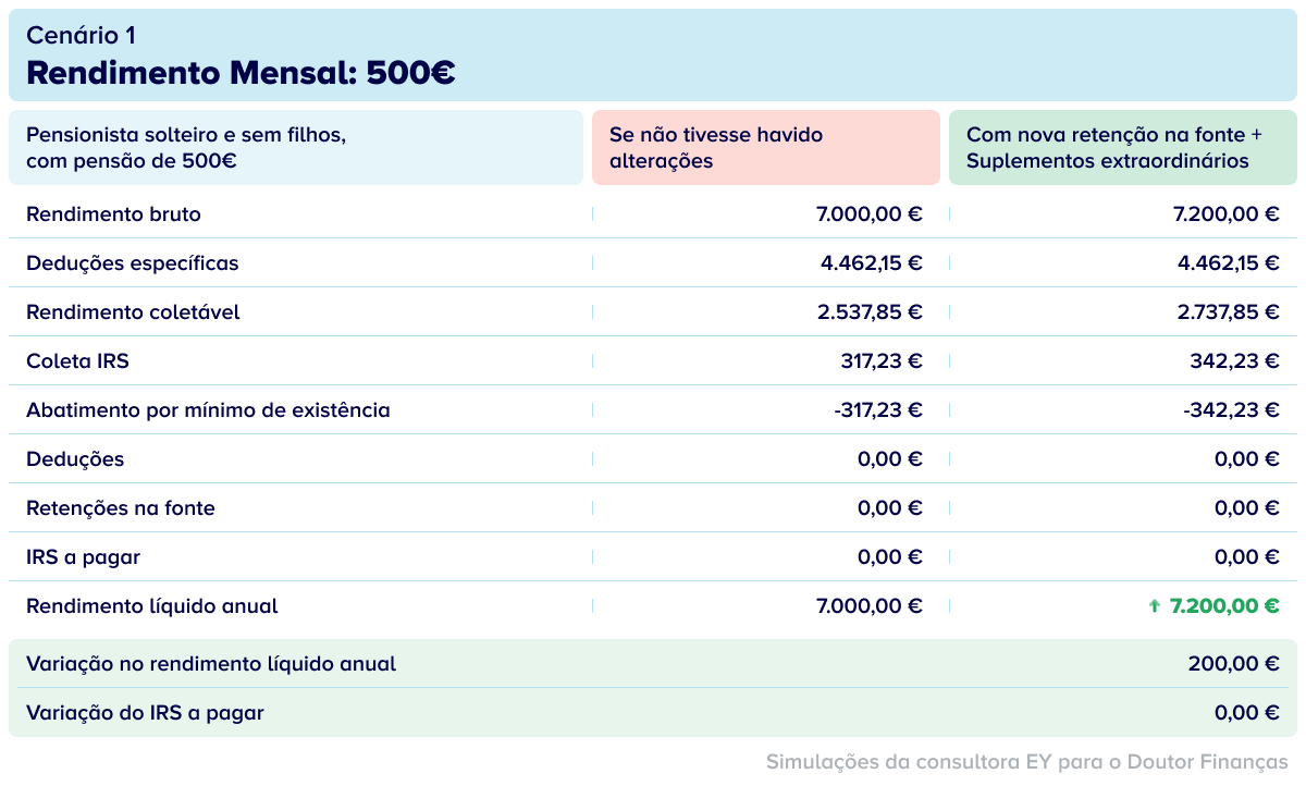 Quem recebe 500 euros de pensão não teria de pagar IRS e assim se vai manter, mesmo depois das alterações. Nestes casos, o valor do suplemento extraordinário reflete-se na totalidade no rendimento líquido anual, que passa de 7.000 para 7.200 euros.