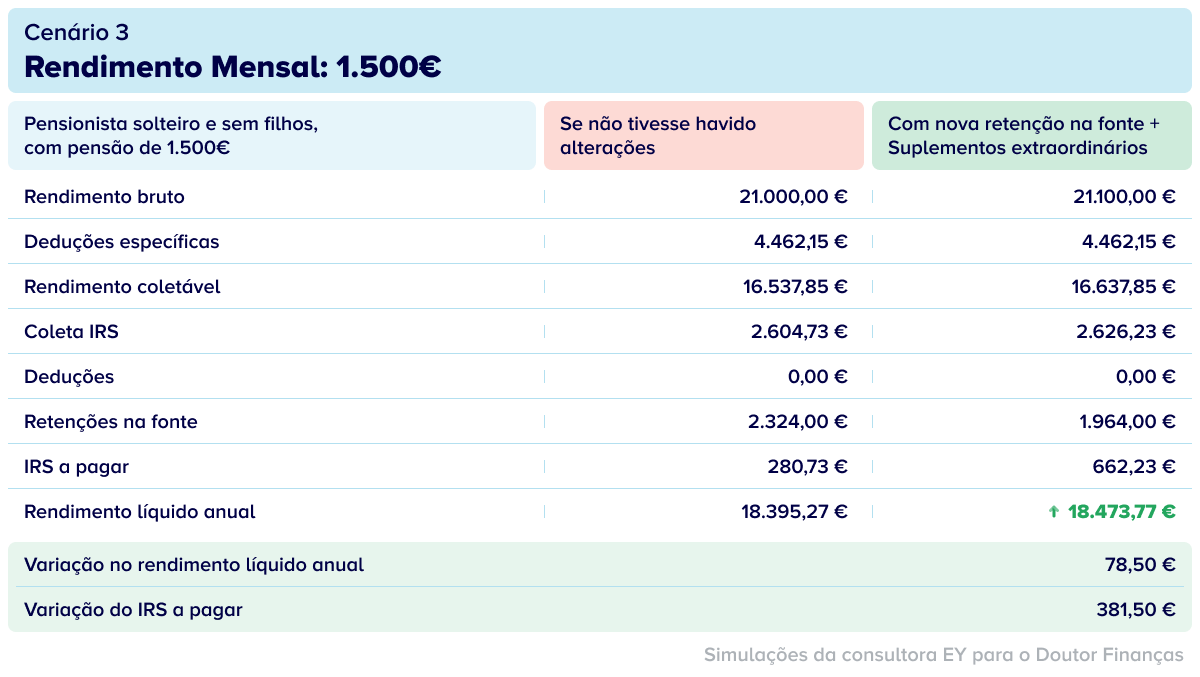 No entanto, isso não altera o facto de que, para os pensionistas que recebem 1.500 euros por mês, a diferença antes e depois das alterações é de 381,50 euros.